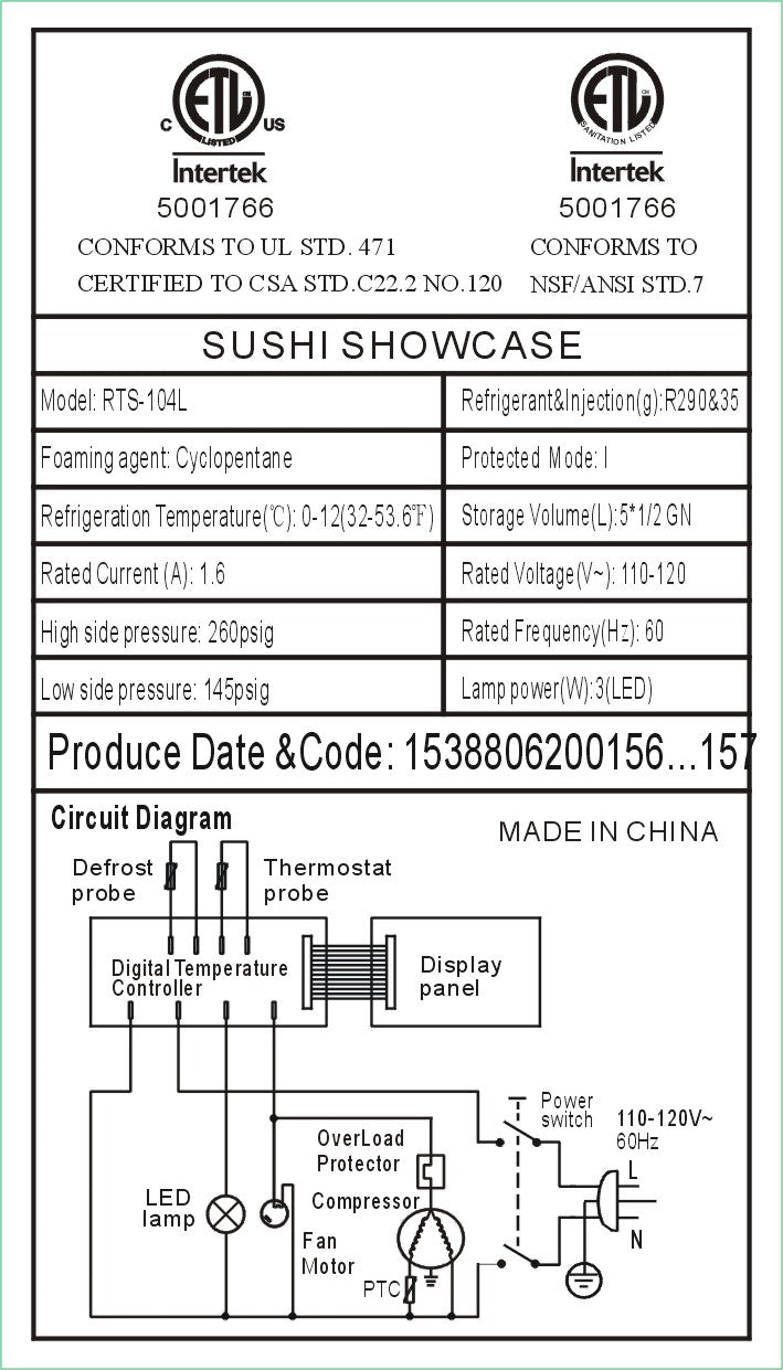 Polarman RTS-104L 69 1/10" Caseta Refrigerada de Contador para Sushi con Puerta Corredera, (5) Tachos de la mitad de tamaño, Negro